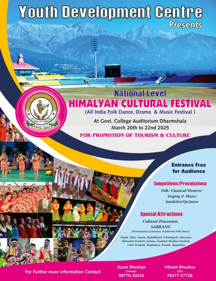 YDC is going to organize National Level “Himalayan Cultural Festival” (All India Folk Dance, Drama & Music Festival) w.e.f 20-03-2025 to 22-03-2025 at Dharamshala, Distt Kangra, for the Promotion of Tourism in Himachal Pradesh and Preservation and Development of Cultural Heritage of India.